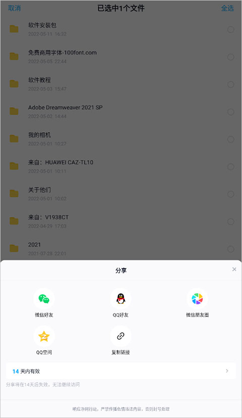 1、选择你想要分享给别人文件,选中之后页面将会出现在平时隐藏的选项,点击其中的“分享”选项即可开始分享,如下图所示: