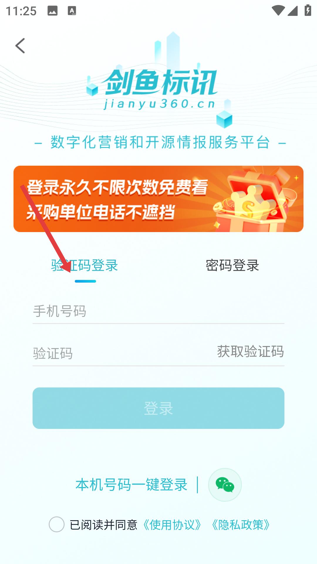2.剑鱼标讯登录界面有验证码登录和密码登录选项,输入信息并勾选协议后登录,首页呈现全国招标信息,涵盖预告、公告等分类。
