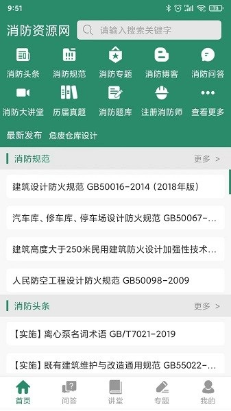 2、在首页功能区,用户可以访问消防头条、消防法规、消防专题、资讯专栏等模块,同时还支持消防问答与案例分享,全面掌握行业最新动态。
