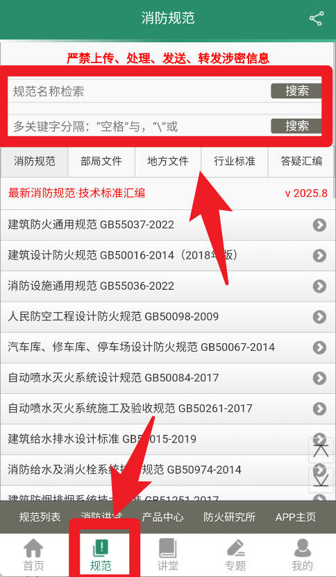 3、在规范板块,用户能够通过关键词或规范名称搜索快速定位目标文件,涵盖部局文件、地方文件和行业标准,方便用户随时查阅标准内容。