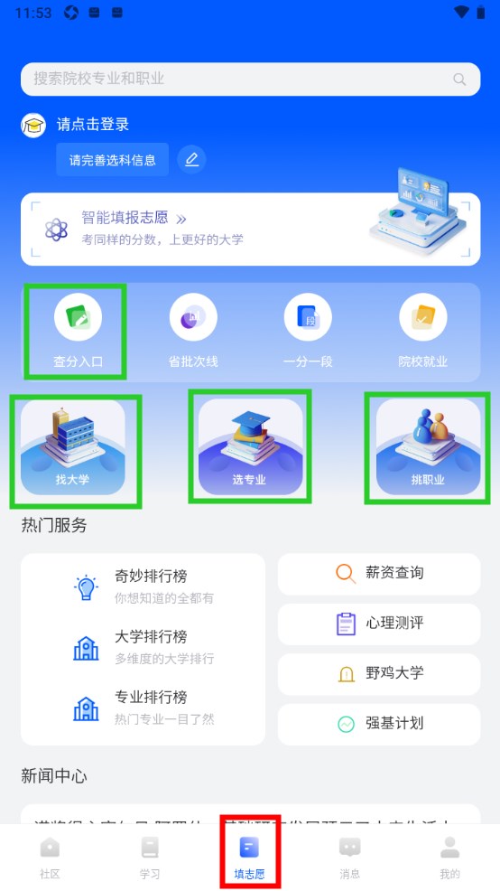 在底部导航栏填志愿内,大家可以找大学、选专业、查院校历史录取分、挑职业等等。