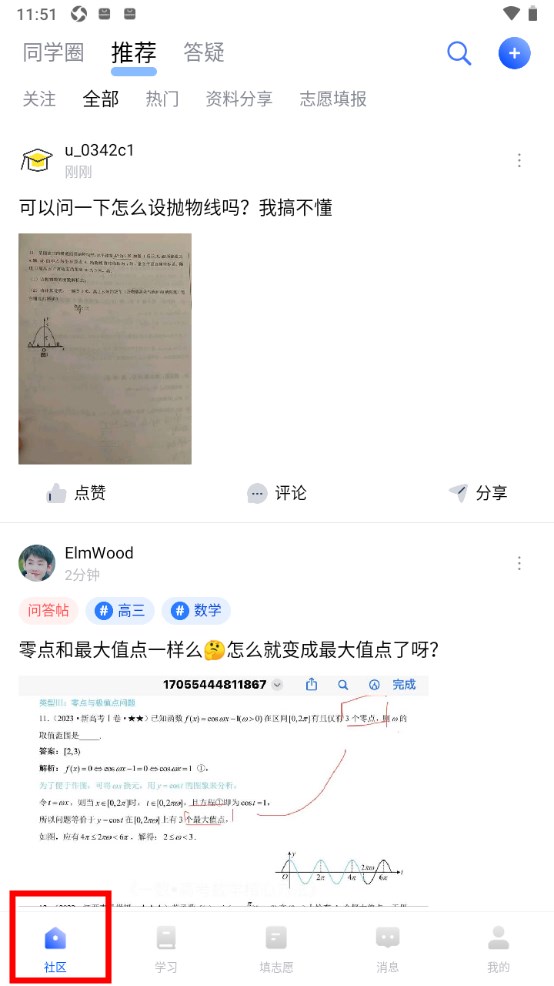 在社区界面,分布了资料分享、志愿填报、二手闲置等板块。大家可以发布问题,大家一起评论探讨。