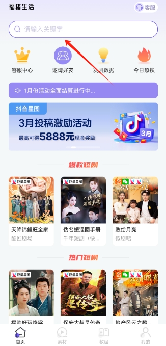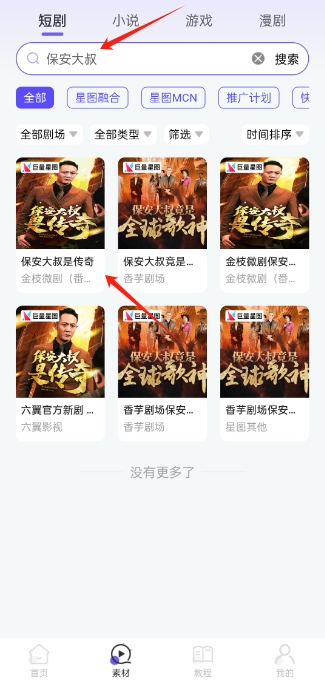 2.在搜索栏搜索短剧名关键词来找到你需要推广的短剧。