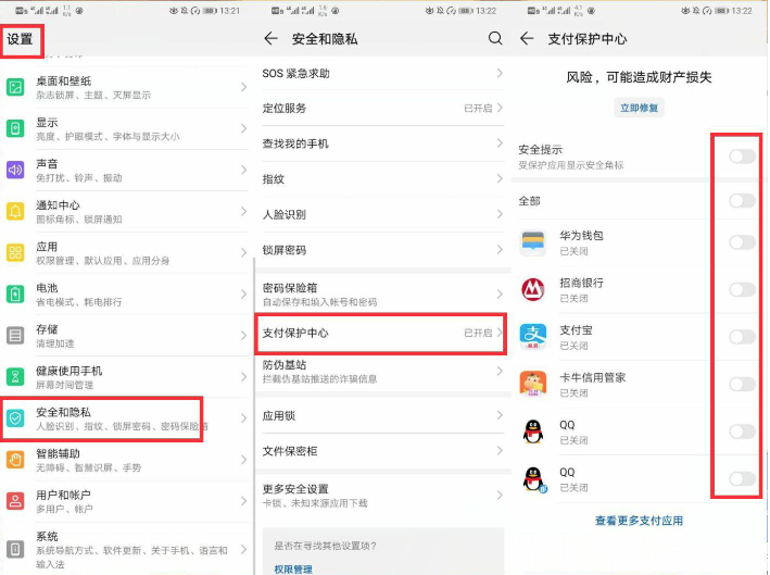 打开手机系统设置--安全和隐私--支付保护中心--将要分享的软件打开权限即可。