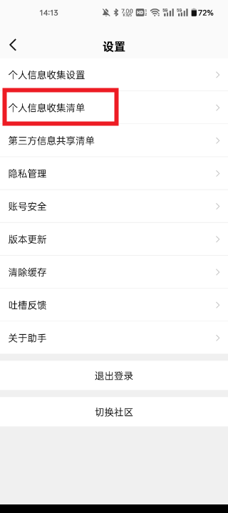 2、然后在设置中找到个人信息收集清单。
