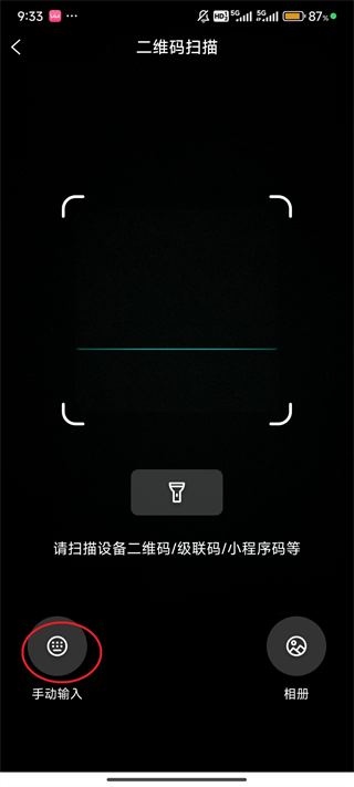 2、通过扫码设备上的二维码来实现连接,如果没办法找到二维码,可以点击屏幕左下角的“手动输入”。