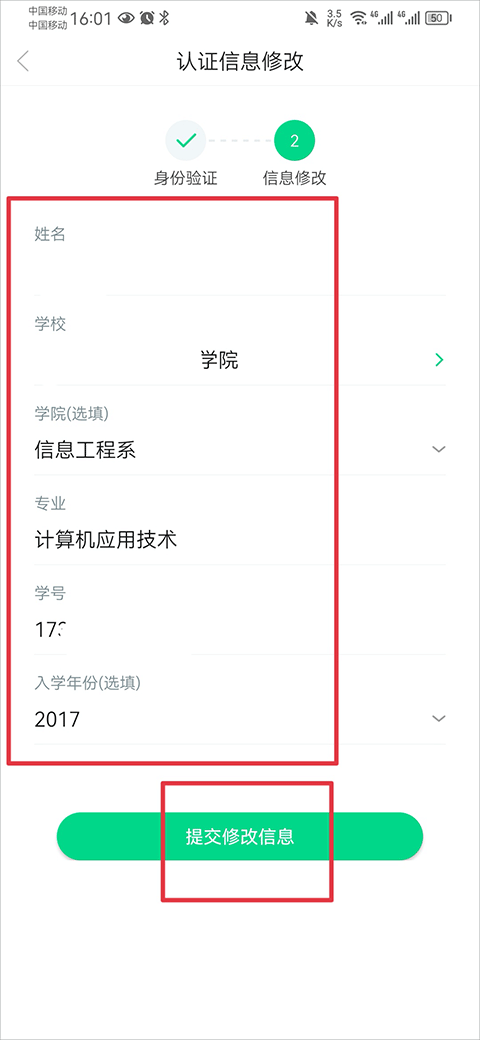 4、最后将正确的学校名称、学号等信息完善后点击提交修改信息即可
