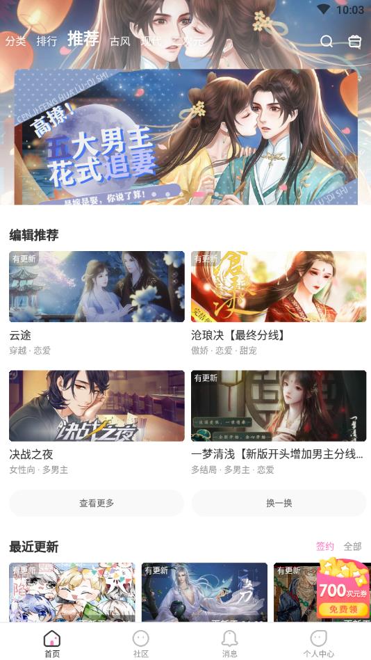 1、首先在本站下载安装好易次元app,首页上有很多交互式小说相关热门推荐!