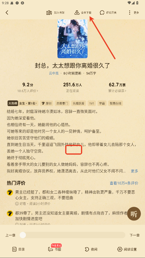 2.点击页面中间部分,打开菜单栏,点击上方全本下载按钮即可。