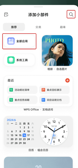 进入「全部应用」或者「搜索」,点击底部的「安卓小部件」。