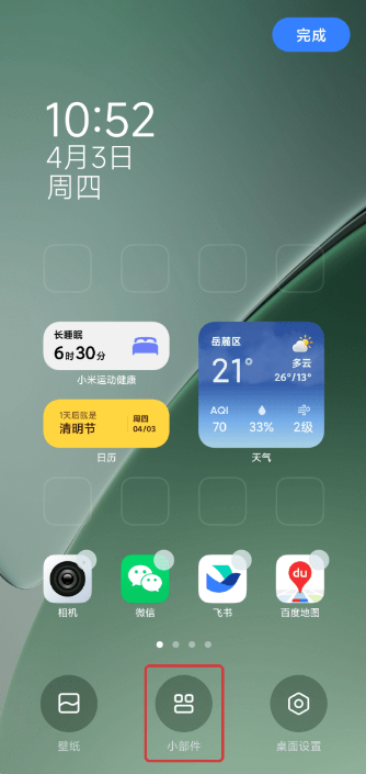 长按桌面空白处或双指缩放屏幕,进入桌面编辑状态,点击下方的「小部件」。