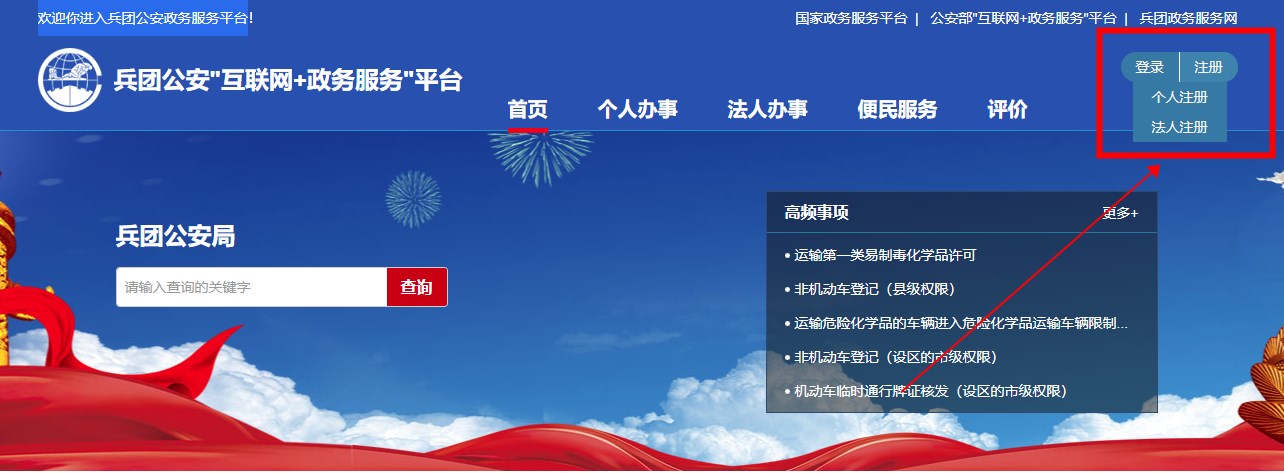 进入兵团公安政务服务平台官方网址。点击右上角注册按钮。