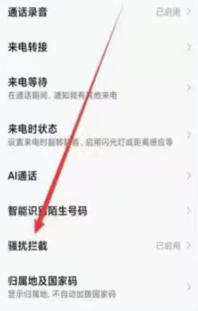 第三步:在通话设置中选择【骚扰拦截】,点击进入。