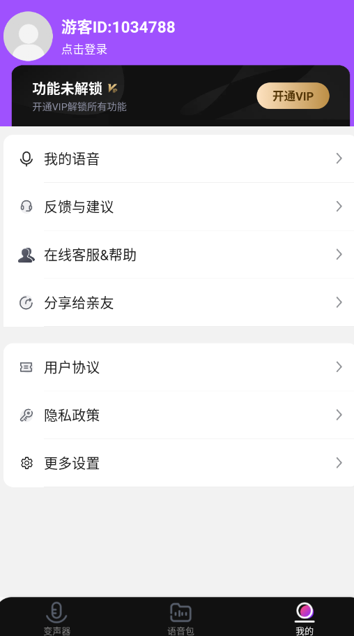 打开全能变声器App,进入首页后找到【语音包】或【语音库】栏目。这里一般会分成萝莉、御姐、大叔、搞怪、节日语音等分类,点进任意语音包可以先试听,确认效果没问题后,点击【使用】【设为当前语音包】或类似按钮。