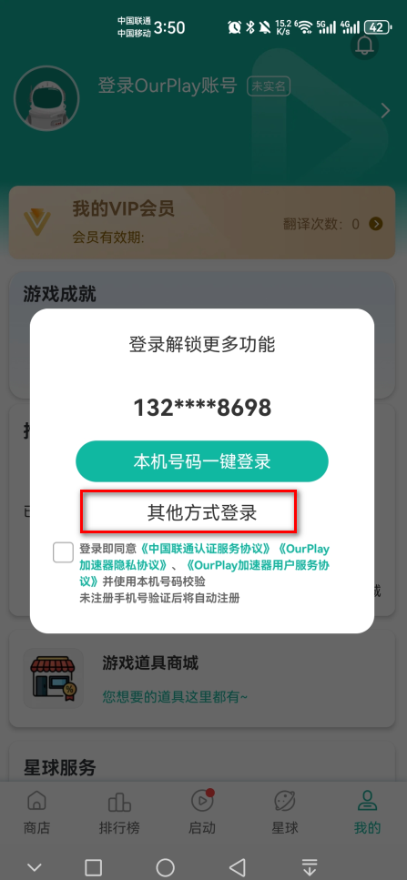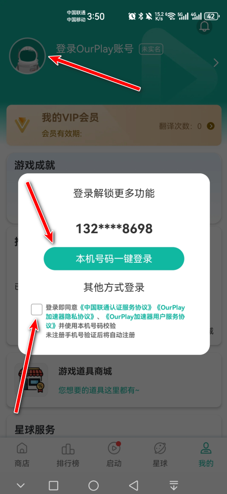 在登录之前,请确保短信和联系人读取权限已授予OurPlay,否则相关权限缺失会导致校验失败。