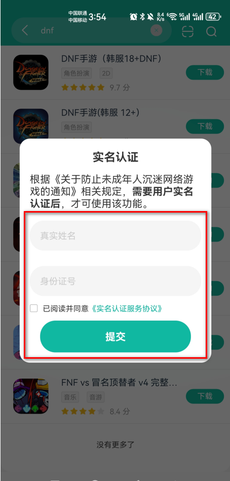 6.一般玩游戏需要实名认证,输入自己的真实姓名和身份证号码即可。并且勾选实名认证服务协议。
