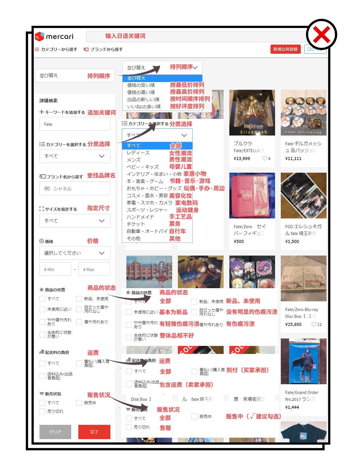 ②搜索特定商品时:直接复制消息来源中商品的日文名称,或使用作品/角色名+常用商品种类进行搜索。