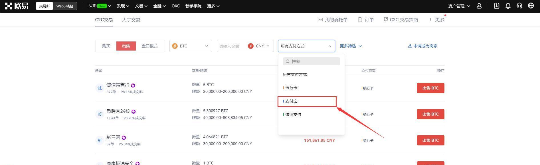 8.选择支付宝支付,在BTC交易页面,选择商家支付宝支付。