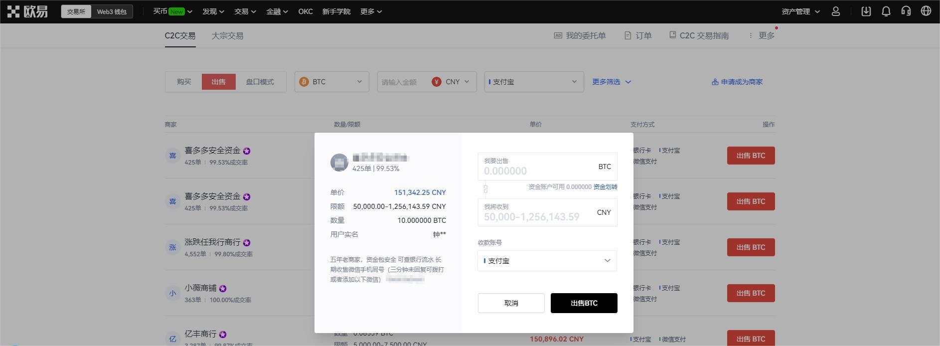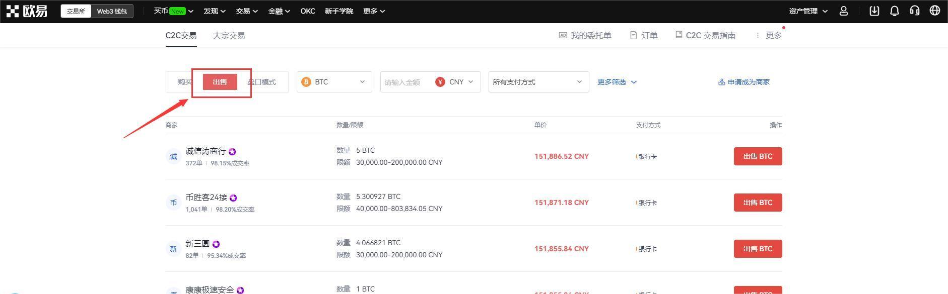 温馨提示:除【快捷买币】区进行卖币之外,您也可以选择【C2C买币】区进行交易—【出售】选择商家,以及合适的价格。如果交易金额≥10万元,也可在【筛选】里选择【大宗交易】。