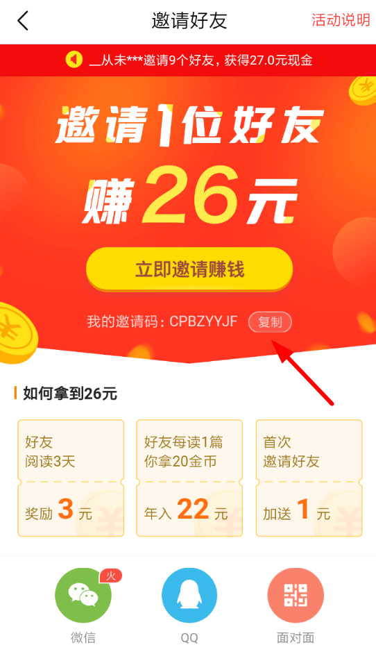 3、对此感兴趣的朋友还可以通过“邀请好友”功能复制自己的邀请码,让其他人注册今日头条极速版并填写邀请码,就可以获得现金收益哦!