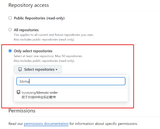 选择私钥的权限范围(请尽可能的缩小范围,保证安全) 务必选择 Only select repositories 这一项,然后选择我刚刚创建的仓库
