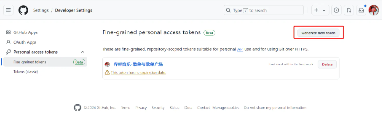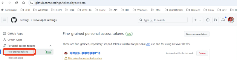 点击 Personal access tokens -> Fine-grained tokens