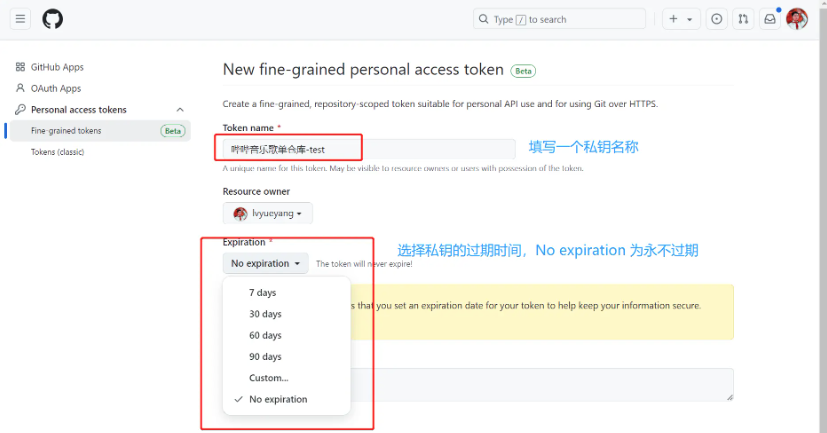 访问地址https://github.com/settings/tokens?type=beta按照下图操作