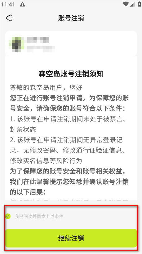 5.勾选我已阅读并同意上述条件,点击继续注销。