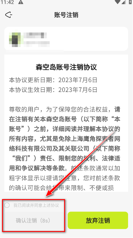 6.勾选我已阅读并同意上述协议,然后点击确认注销。