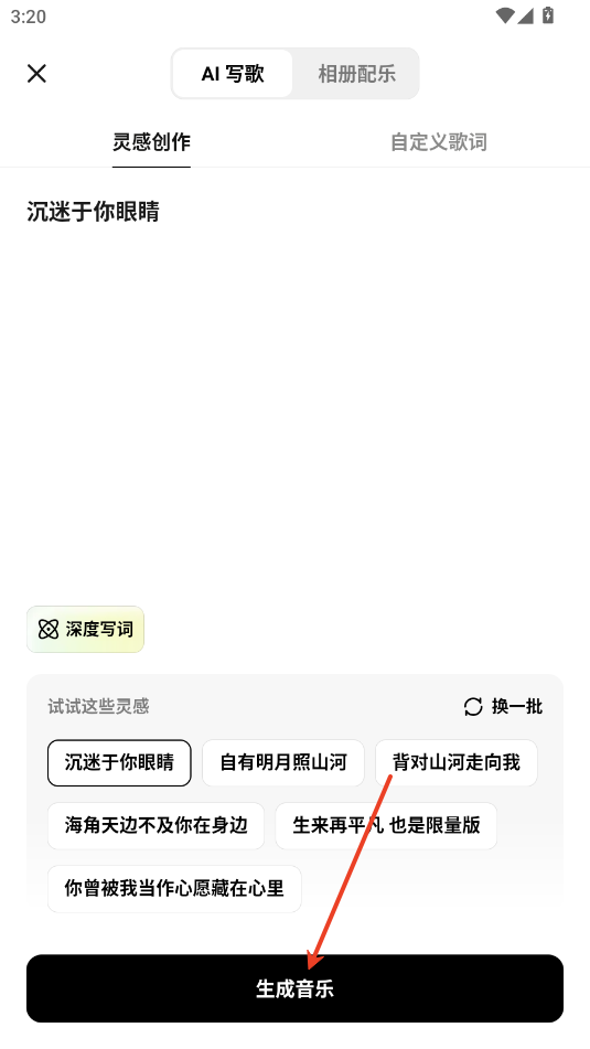 2.选择灵感关键词,点击生成音乐。