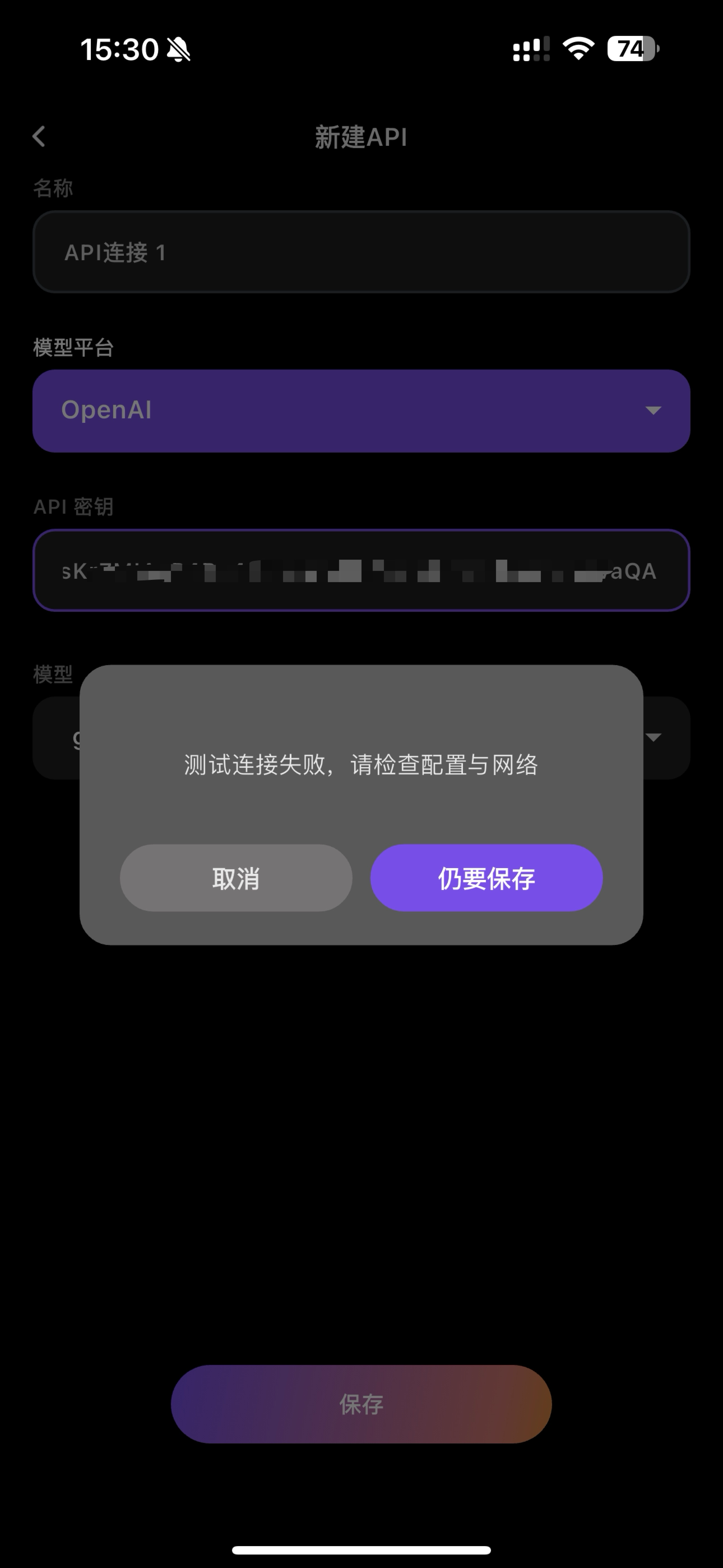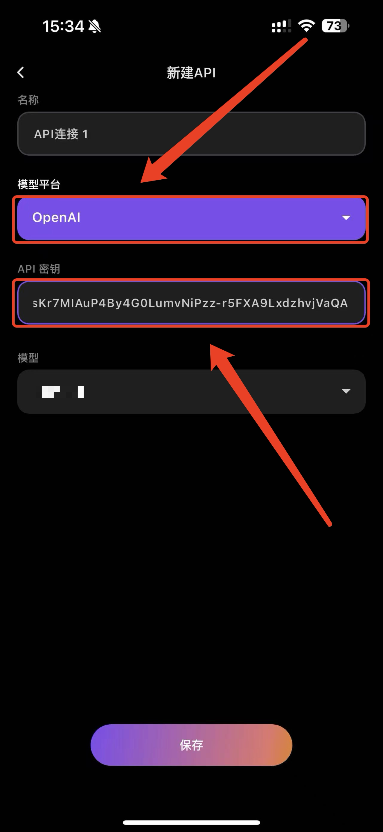 5.填入API并选择对应的模型平台和模型点击“保存”
