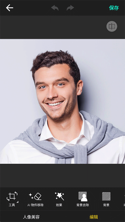 2、从相册中导入图片素材,使用下方的编辑工具:效果、背景去除、AI物件移除等调整修改素材图片;