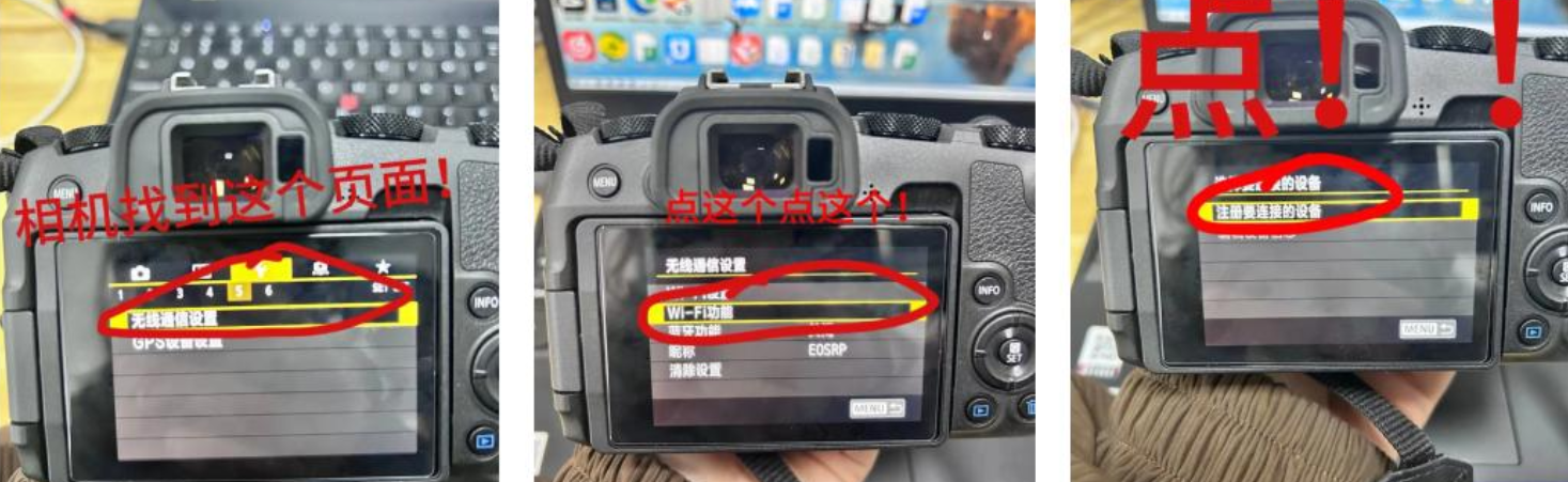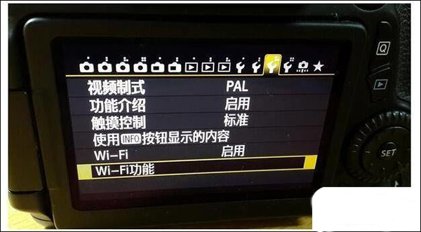 1、点击相机左上角的Menu按钮,如下图所示找出相机的Wifi功能。“Wi-Fi”一行默认状态为关闭,点击改为启用,再点击SET(OK)。这样我们就打开了相机的Wifi功能。