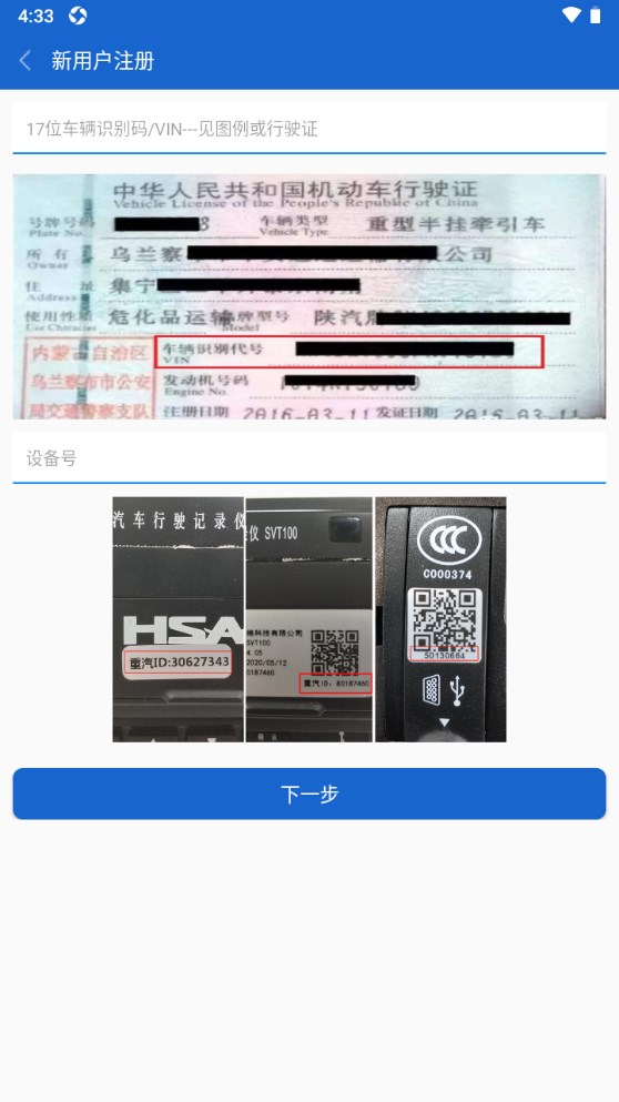 输入17位车辆识别码/VIN或行驶证以及设备号。点击下一步
