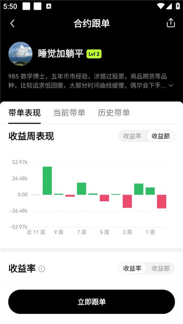 2、在交易员页面,点击头像查看带单详情,或选择【立即跟单】进入【跟单设置】,,填入【单笔跟单金额】和【最大跟单金额】信息,点击【立即跟单】。但是当您有合约持仓和合约交易时,需要先平仓和取消订单,才能成功跟单。