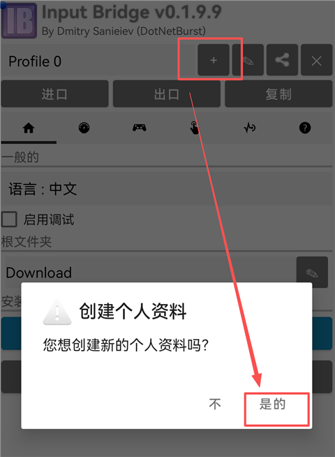 9、接下来进行按键设置,打开InputBridge虚拟键盘软件,点击【+】标识,选择【是的】。