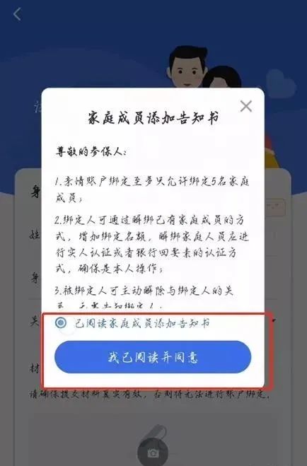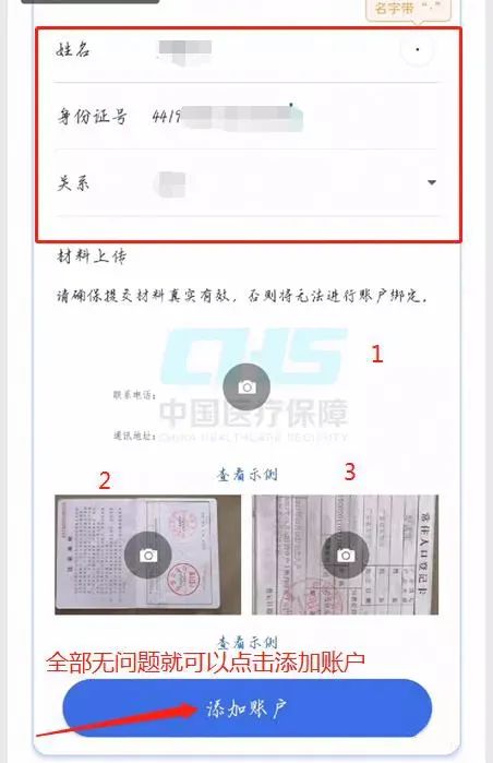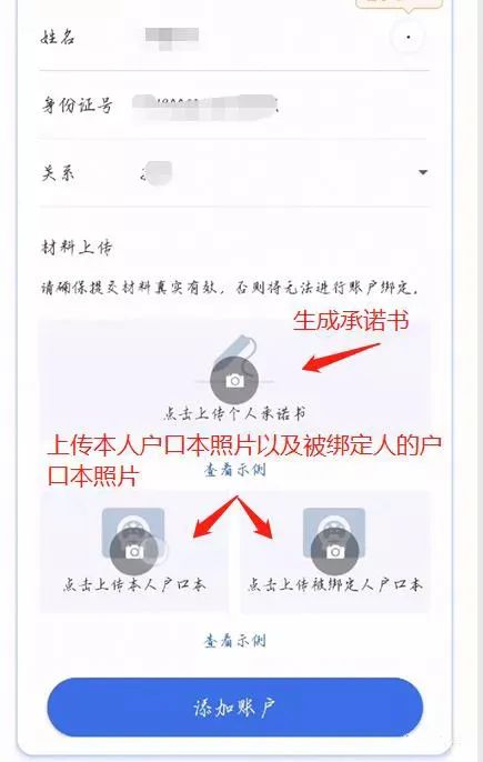 10.确认被绑定人员的身份信息和承诺书、户口本照片是否有误,无问题的话即可点击最下方“添加账户”,如果被添加的家庭成员大于16岁,点击“添加账户”后,要求选择“人脸识别”或“银行卡验证”方式完成家庭成员认证。