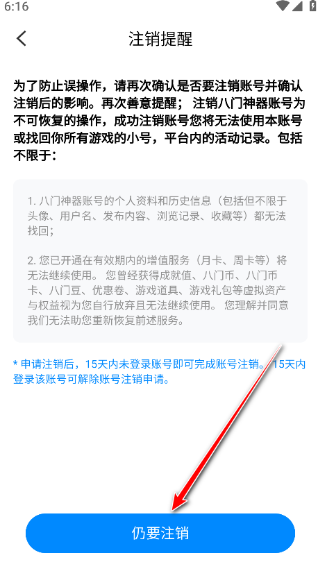 5.先勾选我已阅读并同意《八门神器账号注销须知》,再点击下一步。