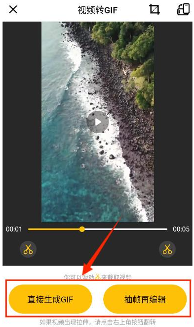 4、从相册或文件存储处选择目标视频,随后界面会给出两种转换方式,可选择直接转gif,也能采用抽帧转gif。