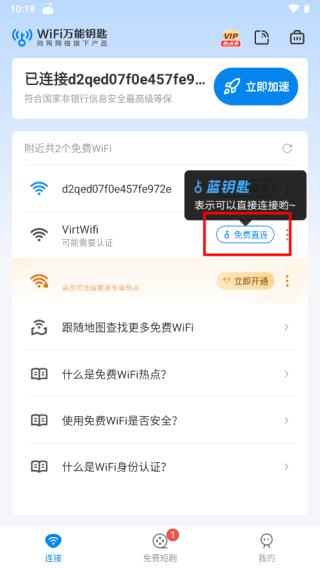 1、进入app,打开手机WiFi功能,即可自动搜索附近WiFi,有蓝钥匙表示可以直接连接,点击蓝钥匙;