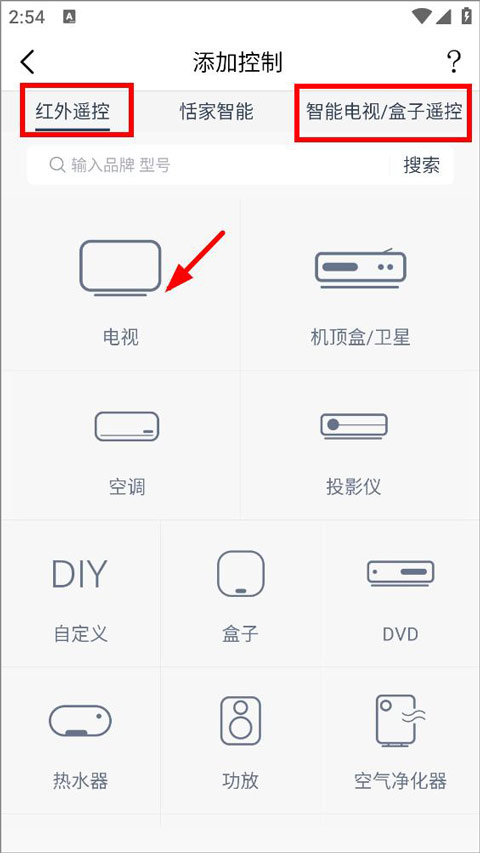 2.进入添加控制页面,用户可选择红外遥控或者智能电视/盒子遥控;