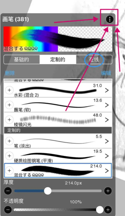 参数调整:长按笔刷进入编辑模式,可修改透明度、流量、纹理等属性,适配不同画风。