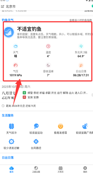4、点击钓鱼指数功能查看专业钓鱼气象建议,包括气压湿度等数据,选择适宜天气进行垂钓。