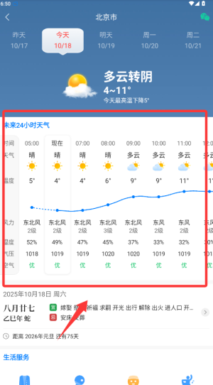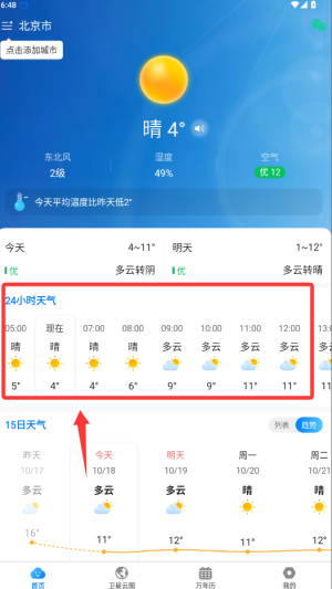 3、使用24小时天气预报掌握全天温度变化趋势,查看未来15天的长期天气预测作为参考。