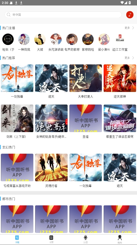 1.打开听中国听书app后,点击底部中间的“书城”,就可以看到听书资源了;