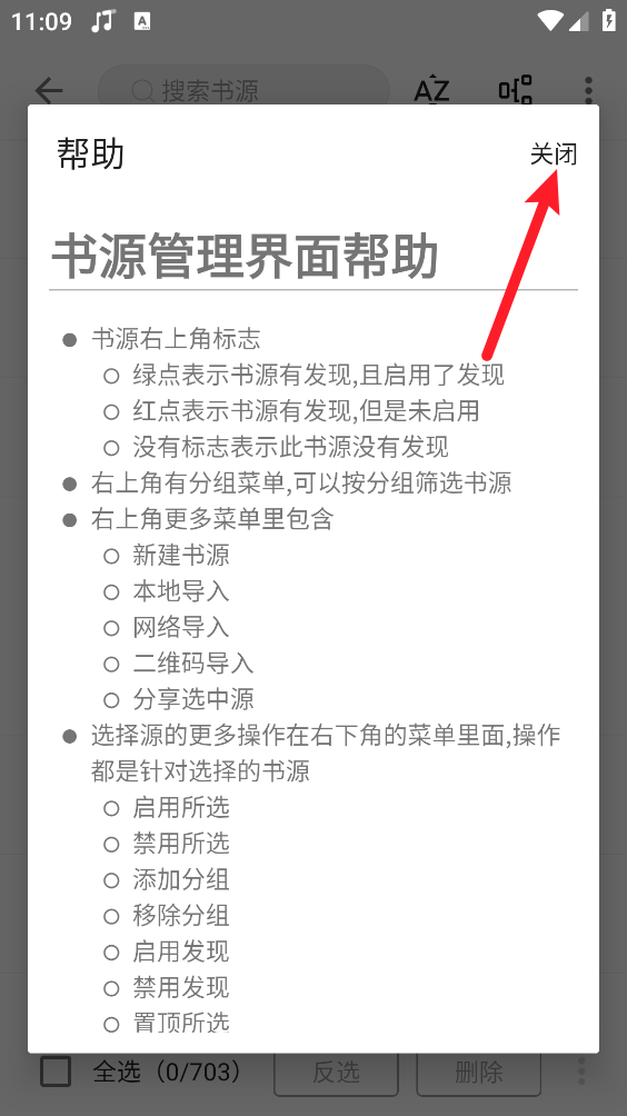 4、然后勾选所需启用的书源,点击右下角三个点。