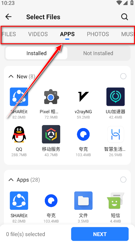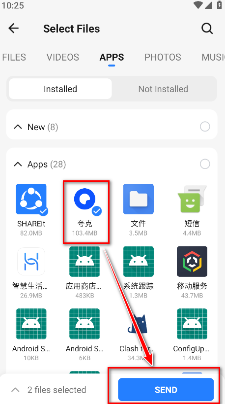 2、选择发送类型(文件/视频/应用/照片)勾选需要发送的内容