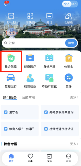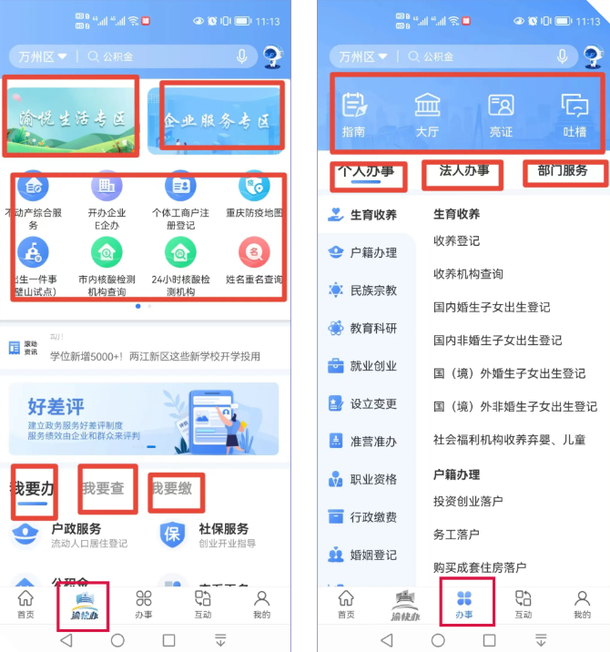 1、点击下方的“渝快办”或“办事”栏目,根据您需要办理的事项类型,点击对应栏目,即可查看办事指南、提交网上办事申请、查验个人证照等信息、在线便民缴费等。