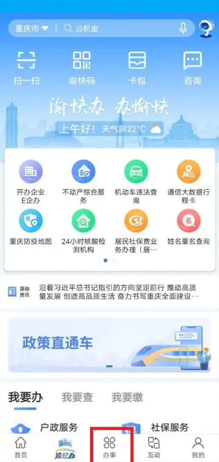 1、下载安装渝快办app,打开软件进入首页,点击下方办事按钮