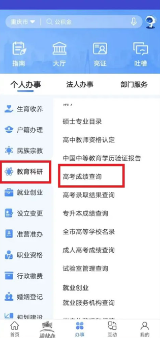 2、在办事页面,选择教育科研分类,高考成绩查询项目